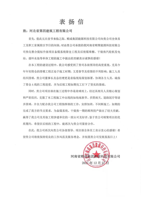 2022年元旦前夕,一封表扬信的到来让十分公司的节日氛围更添喜悦。2021年12月27日,十分公司河南顺聚焦化项目收到来自业主方致公司的表扬信,对项目部攻坚克难争当先锋、诚信履约做出表率提出表扬,同时对项目管理团队在备煤系统筒仓工程及后续工程施工中做出的贡献表示诚挚的感谢。